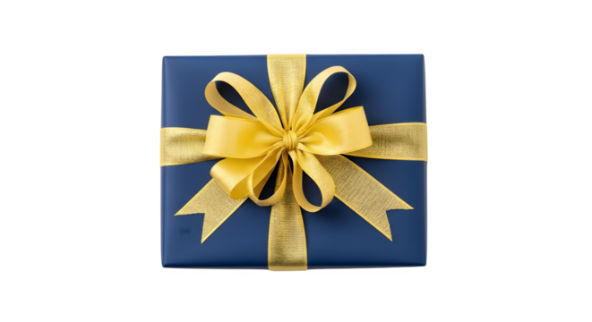 Blue box and gold bow gleam on dark background. Luxury texture creates sophisticated branding, product display, or festive social media designs.