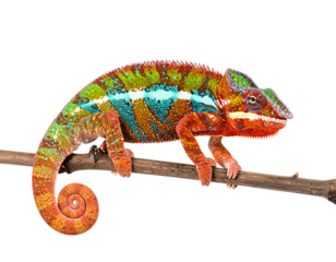 A vibrant chameleon displaying striking red, green, and blue patterns, perched on a branch against a white background.