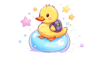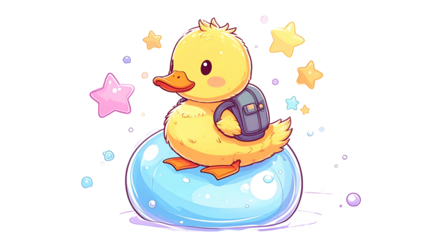 Adorable cartoon duckling with backpack sitting atop a blue bubble, surrounded by stars