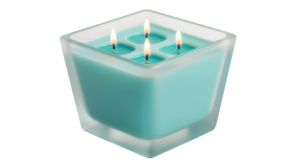 Square blue candle in glass isolated PNG on transparent background, aromatic wax with four wicks for relaxation and home decor