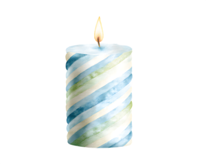 Blue green and white striped candle with lit flame isolated on a transparent background