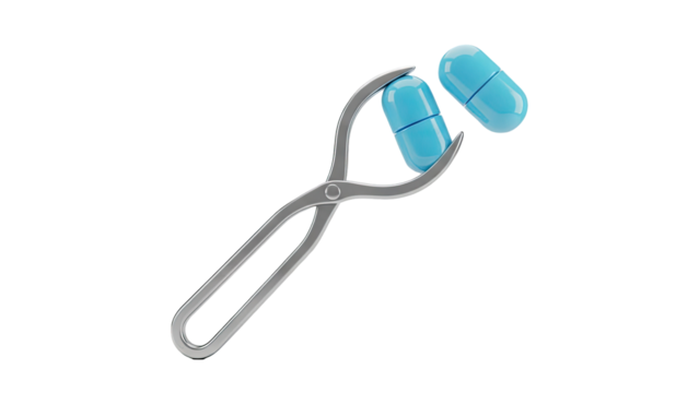 Forceps holding a blue capsule and another capsule nearby on transparent background