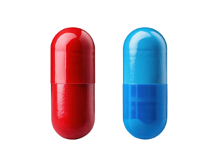 Red and blue capsules representing medicine and health choices.