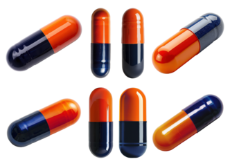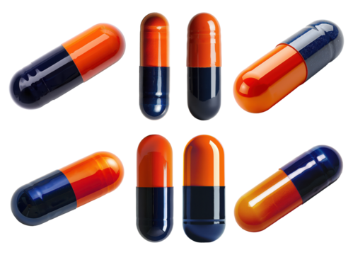 Collection of Glossy Orange and Blue Capsules with Reflective Finish for Medical Use.
