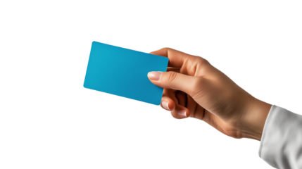 Close-up of a human hand delicately holding a blank rectangular blue card, ready for personalized content or branding, presented against a clean white background