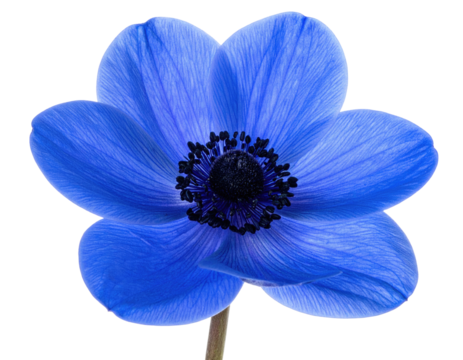 A vibrant close-up of a blue anemone flower with black center on a black background