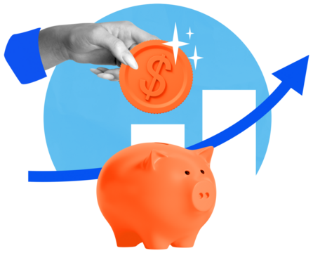 Orange piggy bank and hand holding coin with dollar sign isolated on white, abstract blue chart background, concept of saving money and investment growth