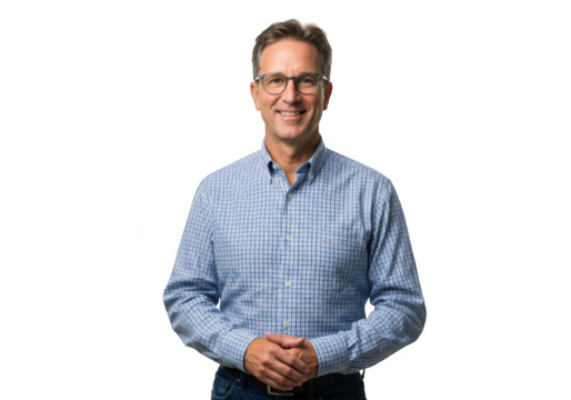 PNG of Smartly dressed man in light khaki pants and a blue checkered shirt, exuding professionalism and style.