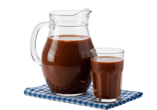 sparkling glass pitcher and tumbler of rich dark chocolate milk, showing cold condensation, on a blue checkered cloth against a high-key white studio background. concept for beverage advertising