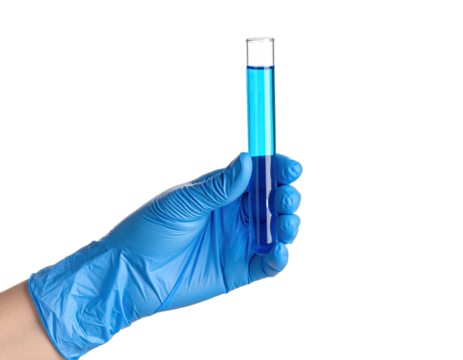 Gloved hand holding test tube with brilliant blue liquid for medical research, pharmaceutical innovation, or chemical analysis, modern laboratory setting