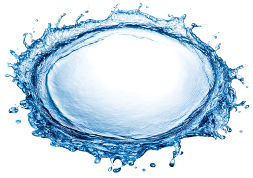 Blue water splash forming a swirling ring and circular frame over a transparent background, showing motion and freshness
