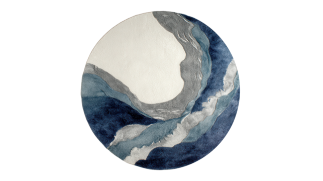 Round contemporary rug featuring abstract flowing waves in various shades of blue, silver, and white, creating a modern fluid art design for interior decor concepts
