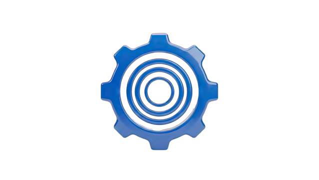 Glossy Blue Cogwheel Symbol with Concentric Circles Inside on Transparent Background