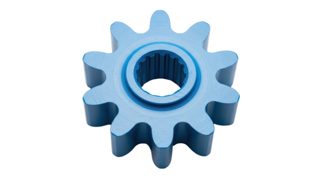 Isolated blue gear wheel with teeth and a central hole used in mechanical engineering