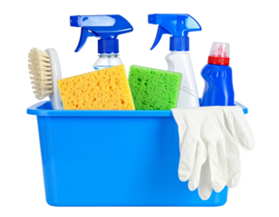 Set of Household Cleaning Tools in Blue Container for Sanitation Concept PNG