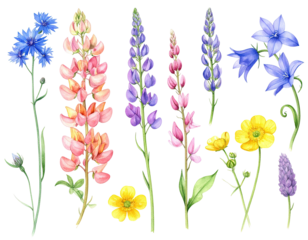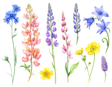 Watercolor painting of a vibrant wildflower meadow with red poppies, blue cornflowers, yellow daisies, and green grass, isolated on transparent background