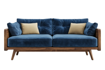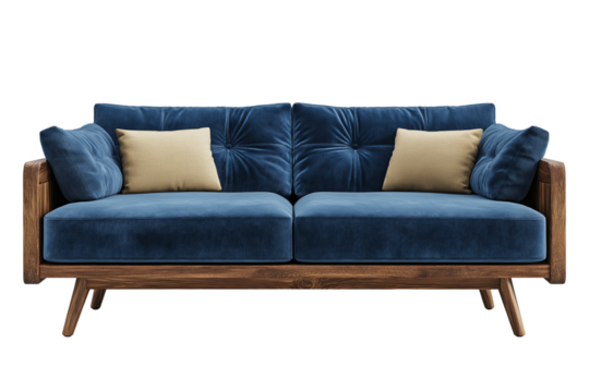 Modern Blue Sofa with Wooden Frame Isolated on Transparent. blue modern sofa, wooden frame sofa, modern blue couch.