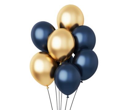 Colorful balloons in gold and navy blue for celebration events on a transparent background, cut out