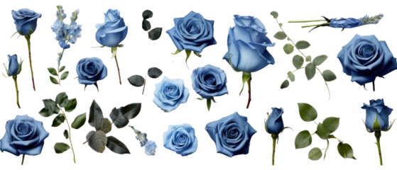 Set of isolated buds, flowers, leaves and blue rose flowers on transparent background. cut flower elements, garden themed designs. Top view high quality PNG." design elements, top view / flat lay
