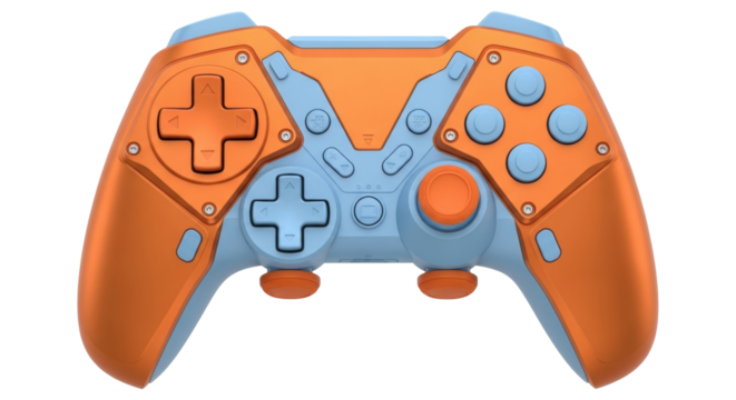 Isolated video game controller for gamer with orange and blue design for entertainment