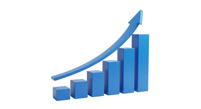 A blue bar graph with an upward trend and a light blue arrow on a transparent background showing growth