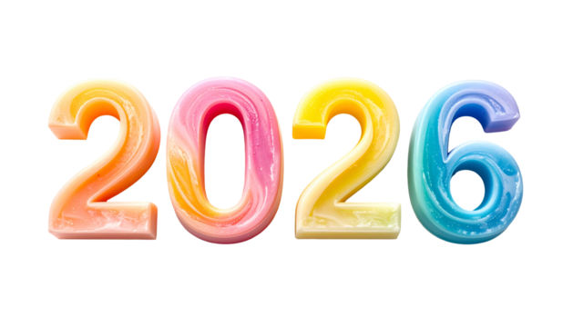 The year 2026 rendered as colorful, swirled, glossy, and layered digits