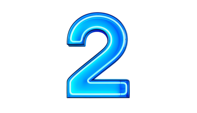 A vibrant, neon blue digit '2' with a black background. The number has a glowing, futuristic appearance