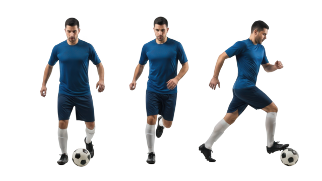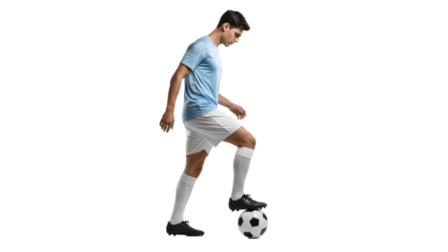 Young male athlete in light blue jersey and white shorts skillfully dribbling a soccer ball during a professional game on transparent background