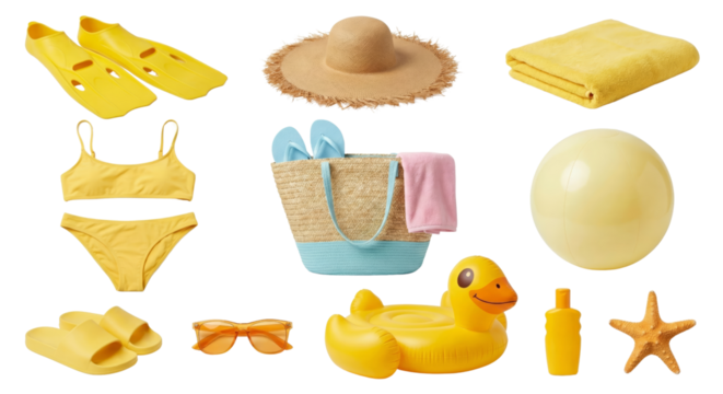 A collection of colorful summer beach accessories and essentials on isolated transparent background