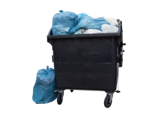 Blue plastic wheeled trash bin for waste collection and recycling, isolated on white background, perfect for environmental and urban themes