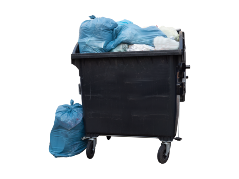 Blue outdoor trash bin with wheels isolated on white background, waste container for garbage collection, perfect for recycling waste management