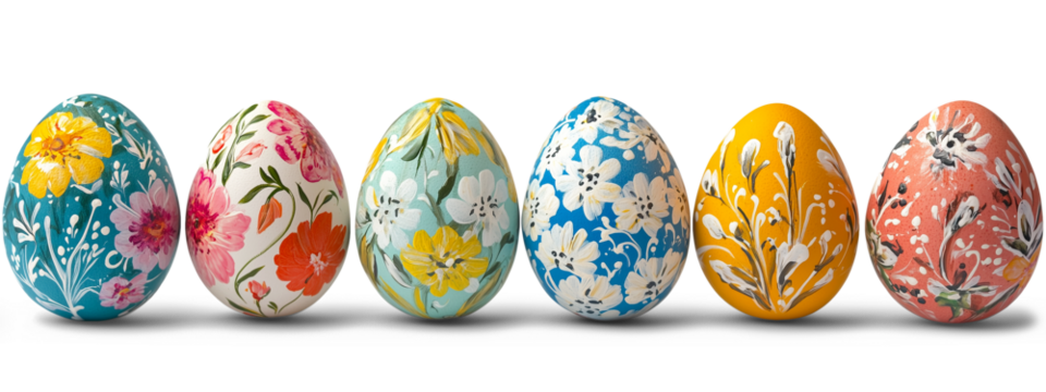 Decorative Easter eggs painted with vibrant colors like blue, pink, green, yellow, and red, arranged in a row, isolated PNG on transparent background.