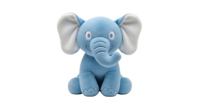 Cute blue elephant plush toy isolated PNG on transparent background, soft stuffed animal for kids and baby room decor