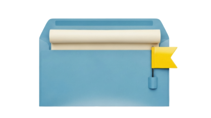 Isolated blue envelope with rolled parchment and yellow flag sticking out, on background
