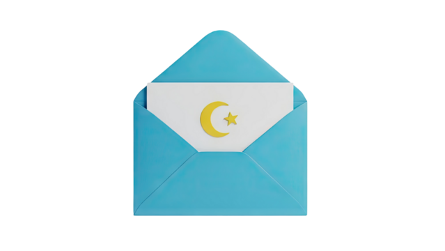 3D Blue envelope with paper and crescent moon and star on transparent background