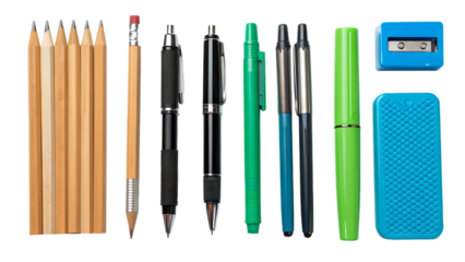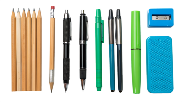 A collection of colorful pencils, pens, a green highlighter, a metal ruler, and a blue eraser arranged neatly on a white background.
