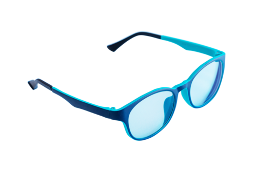 Blue eyeglasses isolated on cut out PNG. spectacles with shiny blue frame For reading daily life To a person with visual impairment. White background as background health concept with copy space
