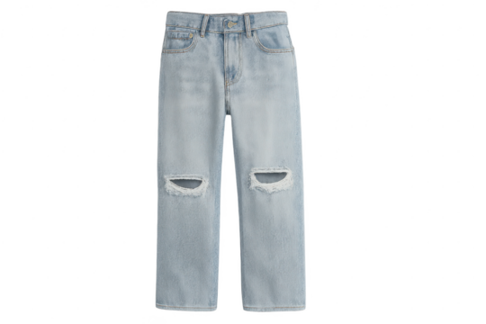 Denim pants in a mid-wash with light fading and darker seams, isolated on black