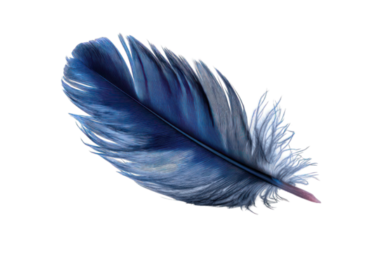 A single blue feather from a bird, with beautiful soft and detailed texture, delicate and lightweight on a calm background, isolated on a transparent background