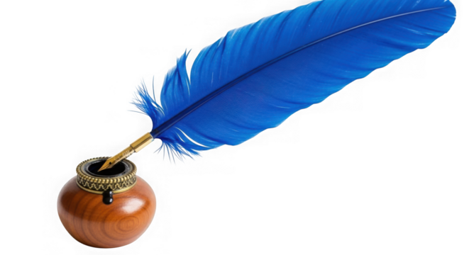 A blue feather quill in a wooden inkwell on a transparent background is a classic writing tool