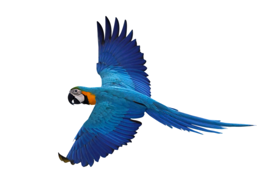 Colorful flying Blue and Gold Macaw parrot isolated on transparent background png file