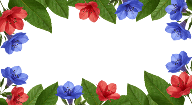 Patriotic American Flag Border with Vibrant Red and Blue Flowers, Festive Decoration USA white frame floral summer, isolated on transparent background.