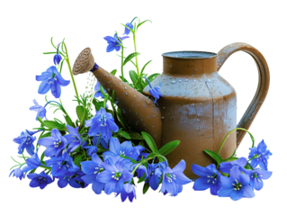 Rustic brown watering can surrounded by vibrant blue flowers, perfect for gardening and nature-themed designs and projects.