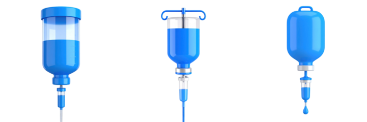 3D Plastic Style Medical Infusion Drips Against Transparent Background Displaying Blue Fluid within Bottles Representing Healthcare Treatment