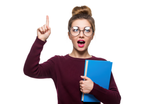 A young woman holds a blue folder in her left hand and her right index finger is raised isolated on transparent background