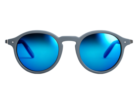 Stylish round sunglasses with silver frames and vibrant blue mirrored lenses are isolated on a transparent background as a clean png.