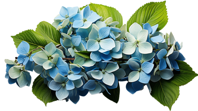 A serene display of hydrangeas in pastel blue, framed by lush greenery, ideal for romantic settings, studio view, isolated on transparent background.