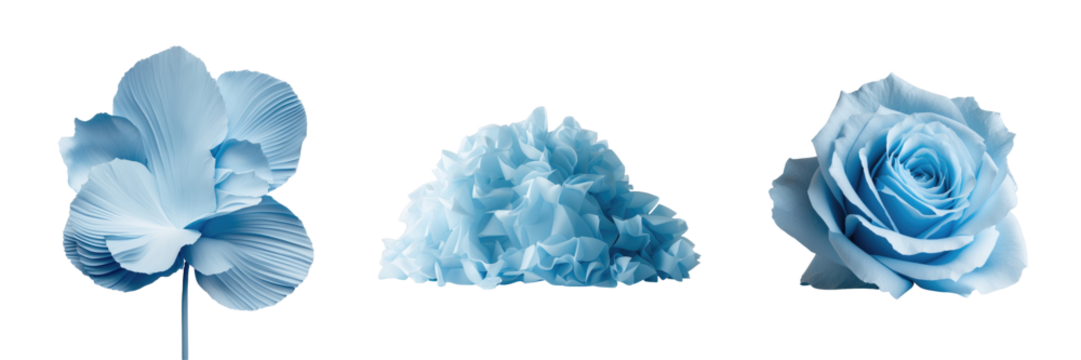 Light blue decorative elements including a flower, ruffled texture, and rose on a transparent background useful for various graphic design applications.