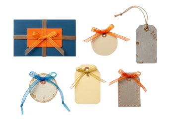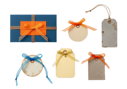 Winter sale tags with blue ribbon and bow isolated on transparent background