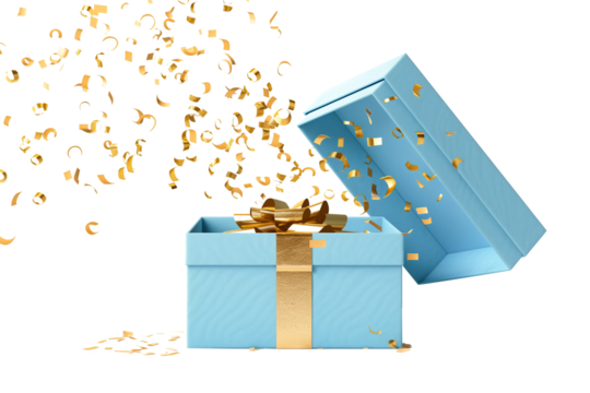 Open a light blue gift box with golden confetti scattering an isolated transparent background